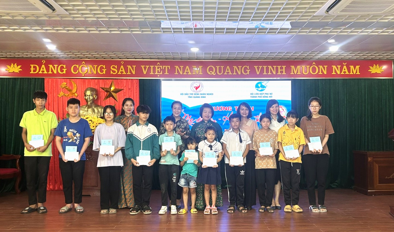 Ngày 23/6/2023, nhân "Tháng hành động vì trẻ em" và Ngày Gia đình Việt Nam (28/6), tại Hội trường Thành Uỷ Đồng Hới, Hội Bảo trợ bệnh nhân nghèo tỉnh Quảng Bình đã tiếp tục triển khai hỗ trợ thêm cho 11 trẻ mồ côi là con của các bệnh nhân nghèo, gia đình có hoàn cảnh đặc biệt khó khăn trên địa bàn TP. Đồng Hới.