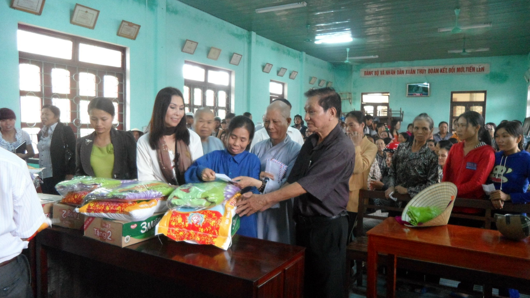 Ni sư Thích Nữ Như Minh trao cứu trợ lũ lụt ở xã Xuân Thủy, huyện Lệ Thuỷ năm 2016.