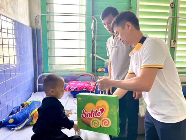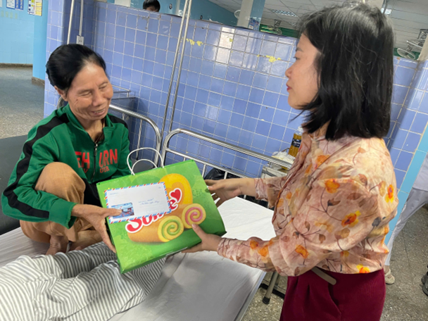 Trao những phần quà đến tận giường bệnh Trao món quà nhỏ bé nhưng chứa đựng nhiều tình cảm, chị Dung chân thành chia sẻ với Chủ tịch Hội Bảo trợ Bệnh nhân nghèo tỉnh: “ Cháu không có nhiều, chỉ dành được 5 triệu đồng hỗ trợ cho các cháu khó khăn thôi. Nhưng đây là tấm lòng của vợ chồng cháu, mong các cháu và gia đình có thêm niềm vui và nghị lực để vượt qua tất cả ”.