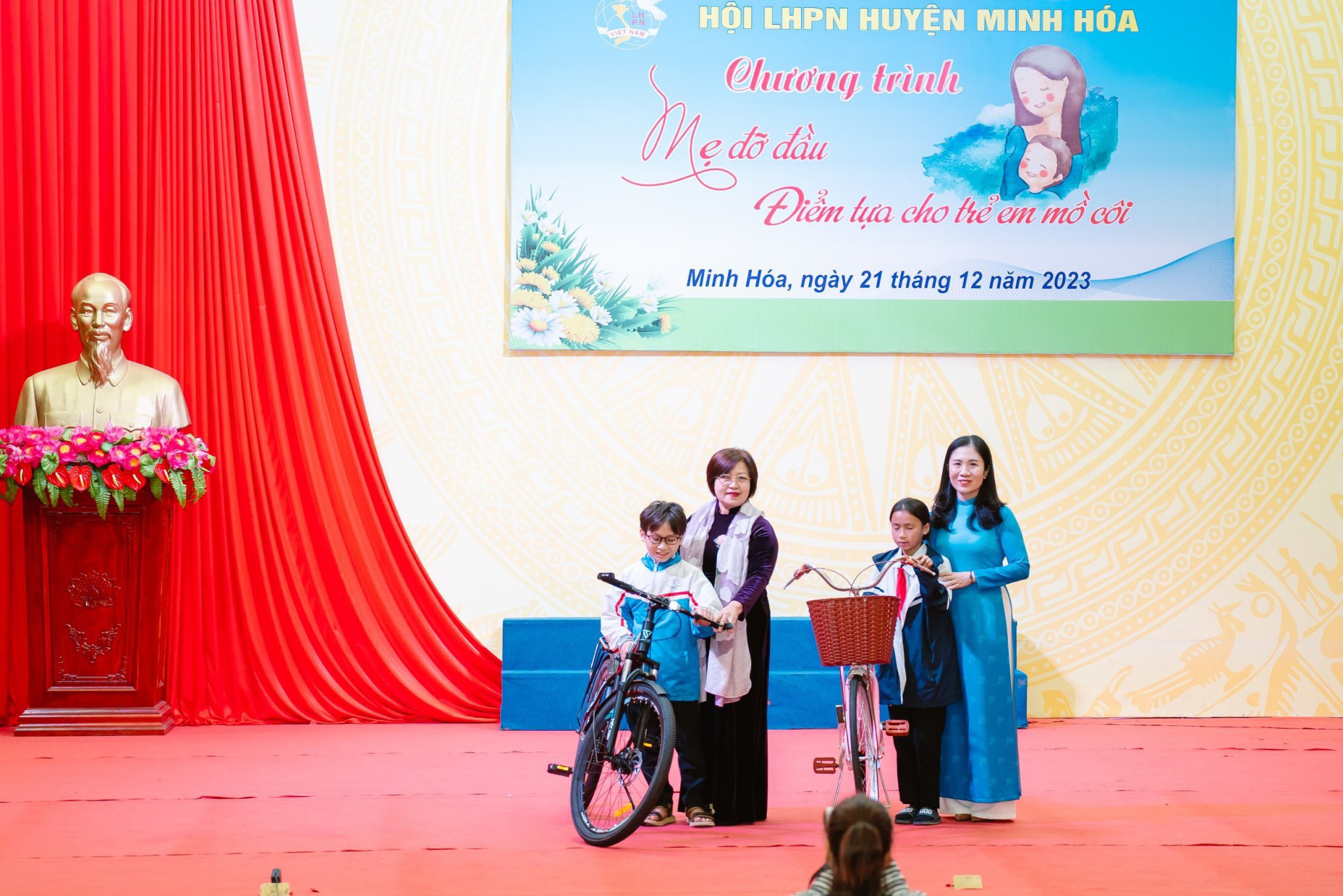 Nhận đỡ đầu 10 trẻ mồ hồi Huyện Minh Hóa với số tiền 120 triệu đồng. Ngày 21/12/2023, Hội Bảo trợ bệnh nhân nghèo tỉnh Quảng Bình tiếp tục nhận đỡ đầu 10 trẻ mồ côi có hoàn cảnh đặc biệt khó khăn của huyện Minh Hóa trong 2 năm với tổng số tiền 122 triệu đồng. Để tiếp tục lan tỏa giá trị nhân văn sâu sắc của Chương trình “Mẹ đỡ đầu - Kết nối yêu thương”, tiếp thêm động lực, chắp cánh ước mơ cho những đứa trẻ mồ côi và hy vọng cuộc đời của các em tươi sáng hơn, hạnh phúc hơn, Thường trực Hội Bảo trợ bệnh nhân nghèo tỉnh Quảng Bình đã tham dự và trao hỗ trợ cho 10 trẻ mồ côi có hoàn cảnh đặc biệt khó khăn do Hội nhận đỡ đầu với tổng số tiền 120 triệu đồng. Lần này, Hội đã trao số tiền hỗ trợ trợ tháng 11+12 năm 2023 cho các cháu, số tiền trong thời gian tới sẽ được trao cho Hội Phụ nữ Huyện để trao cho các cháu. Chị Nguyễn Thị Thanh Hương - Chủ tịch HBTBNNN tỉnh Quảng BÌnh Cũng tại hội nghị, Chủ tịch Hội BTBNN đã trao tặng 01 chiếc xe đạp cho em Cao Gia An, 11 tuổi, học sinh lớp 6 trường Trung học cấp 2-3 xã Trung Hóa, huyện Minh Hóa.Hoàn cảnh Gia An rất khó khăn. Cháu nhanh nhẹn và luôn đạt thành tích xuất sắc trong học tập. Bố của Gia An bị suy thận phải chạy thận nhân tạo; mẹ cháu đã bỏ đi nhiều năm không liên lạc được. Hiện Gia An và bố ở với ông nội tại xã Trung Hóa,Huyện Minh Hóa.