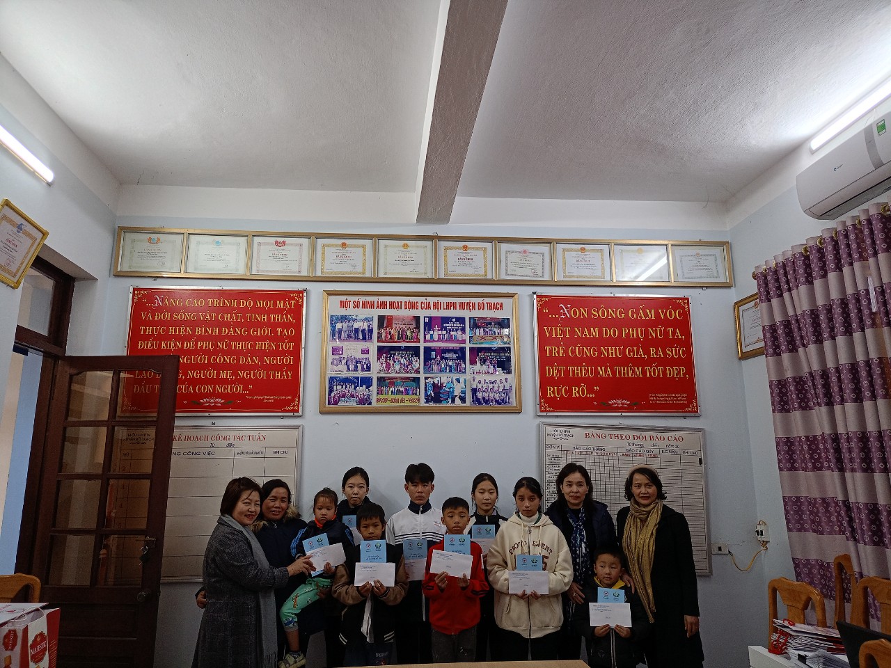Trao tiền hỗ trợ cho 8 em tại Văn phòng Hội phụ nữ Huyện Bố Trạch. Tại Huyện Bố Trạch, với sự có mặt của đông đủ 8 em và gia đình, Hội đã trao tiền hỗ trợ cho 8 em tại Văn phòng Hội phụ nữ Huyện.