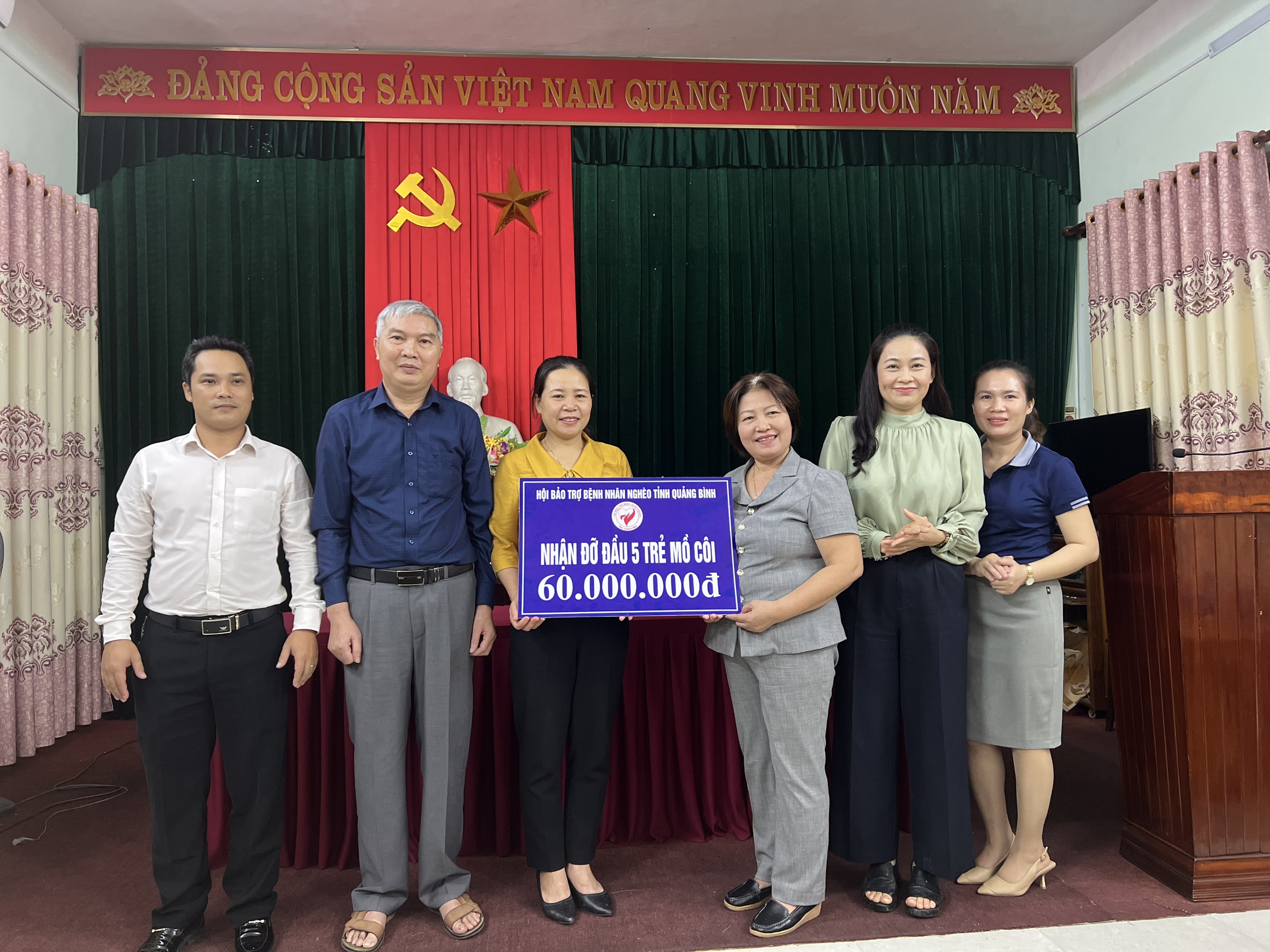 Ngày 14/11/2022, Hội Bảo trợ bệnh nhân nghèo tỉnh Quảng Bình phối hợp với Hội Liên hiệp Phụ nữ tỉnh, Hội Liên hiệp phụ nữ huyện Tuyên Hoá đã đến thăm và trao hỗ trợ cho 05 trẻ mồ côi của huyện Tuyên Hoá với tổng số tiền 60 triệu đồng. Hội BTBNN tỉnh Quảng Bình tiếp tục nhận đỡ đầu Trong đợt này, Hội Bảo trợ bệnh nhân nghèo tỉnh Quảng Bình nhận đỡ đầu thêm 5 trẻ mồ côi của các xã Hương Hoá, Châu Hoá, Thanh Thạch, và Đức Hoá của huyện Tuyên Hoá, mức hỗ trợ 1 triệu đồng/cháu mỗi tháng trong 1 năm, từ tháng 11 năm 2023, tổng số tiền hỗ trợ 60 triệu đồng.