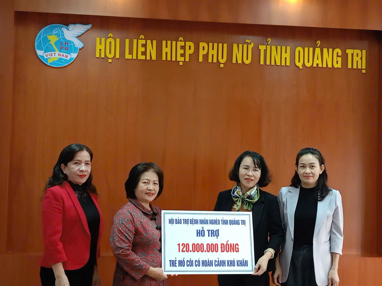 Sau một thời gian phải tạm dừng việc phối hợp hỗ trợ trẻ mồ côi do sắp xếp lại hệ thống tổ chức của các cấp Hội LHPN trong tỉnh, ngày 27/11/2025, Thường trực Hội Bảo trợ bệnh nhân nghèo tỉnh đã đến làm việc và trao bảng tượng trưng số tiền 120 triệu đồng cho Hội LHPN tỉnh Quảng Trị để hỗ trợ 23 trẻ mồ côi có hoàn cảnh đặc biệt khó khăn trên địa bàn toàn tỉnh. Tham dự buổi làm việc có bà Nguyễn Thị Bích Thủy, Tỉnh ủy viên, Phó Chủ tịch UBMTTQ Việt Nam tỉnh, Chủ tịch Hội LHPN tỉnh; các đồng chí trong Thường trực Hội; đại diện các ban và Văn phòng Hội.