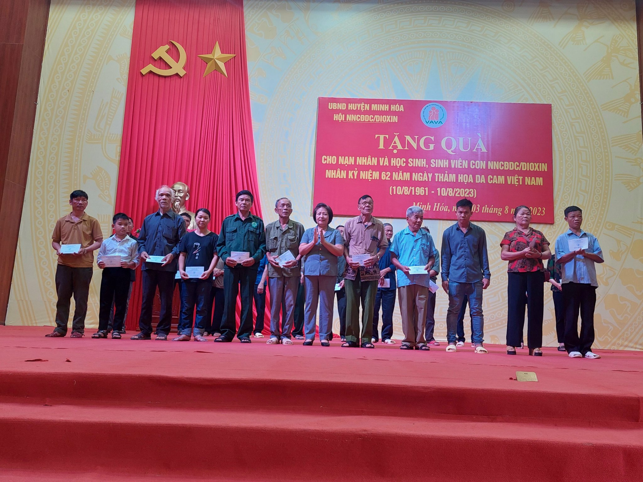 Nhân kỷ niệm 62 năm ngày thảm họa Da cam Việt Nam, Hội Bảo trợ bệnh nhân nghèo tỉnh Quảng Bình đã trao hỗ trợ cho 50 nạn nhân bị nhiểm chất độc da cam dioxin có hoàn cảnh khó khăn và con để của các nạn nhân ở 2 huyện Quảng Ninh và Minh Hóa với số tiền 25 triệu đồng. Ngày 3/8/2023,Chủ tịch Hội Bảo trợ bệnh nhân nghèo tỉnh Quảng Bình đã tham dự chương trình: Gặp mặt, tặng quà cho nạn nhân và học sinh, sinh viên con của nan nhân chất độc da cam dioxin trên địa bàn Huyện Minh Hóa. Chương trình do Hội Nạn nhân chất độc da cam/ di o xin huyện Minh hóa tổ chức nhân kỷ niệm 62 năm thảm họa Da cam Việt nam và tháng hành động vì Nạn nhân Da cam/Dioxin. Quang cảnh chương trình gặp mặt, tặng quà cho nạn nhân và học sinh, sinh viên Tham dự chương trình có Đại diện lãnh đạo Huyện ủy, Lãnh đạo UBND, UBMTTQ Việt nam Huyện Minh Hóa, Lãnh đạo Hội Nạn nhân chất độc da cam/ dioxin tỉnh Quảng bình, các nhà tài trợ, các Hội Nạn nhân chất độc da cam/dioxin một số Huyện, xã phường ở Thành phố Đồng Hới và rất đông nạn nhân chất độc da cam/dioxin trên địa bàn Huyện.
